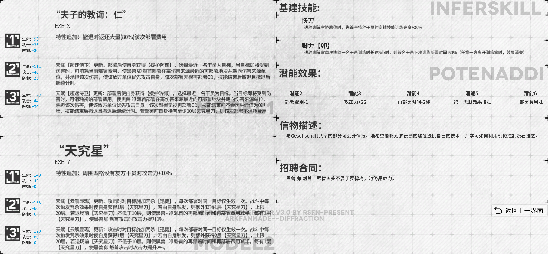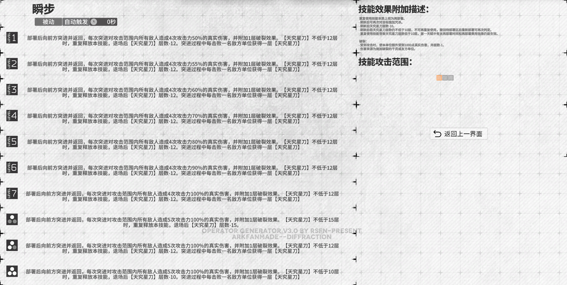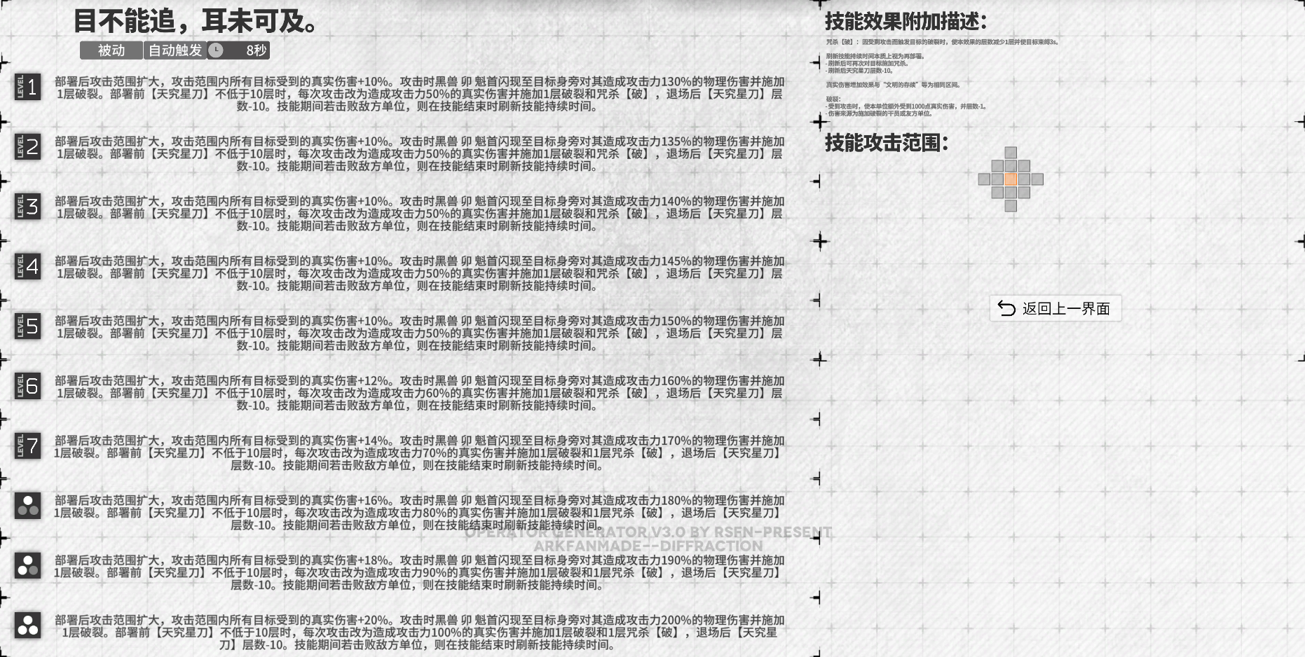 吃攻速,实现快速为单体目标施加破裂。加攻击、增伤实战作用可能更多是清理次数怪和小怪,减小破裂挂在小怪上的概率。本技能叠被动“天究星刀”层数能力较弱,可能需要配合其他联动干员使用。