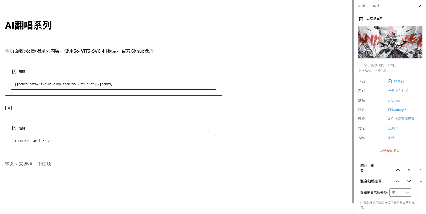 保存后,在”添加页面“的右侧设置栏中会新增一个选项,选择分类并使用“自定义混合归档页面”模板后发布页面,该页面中即可显示指定分类的全部文章和说说。