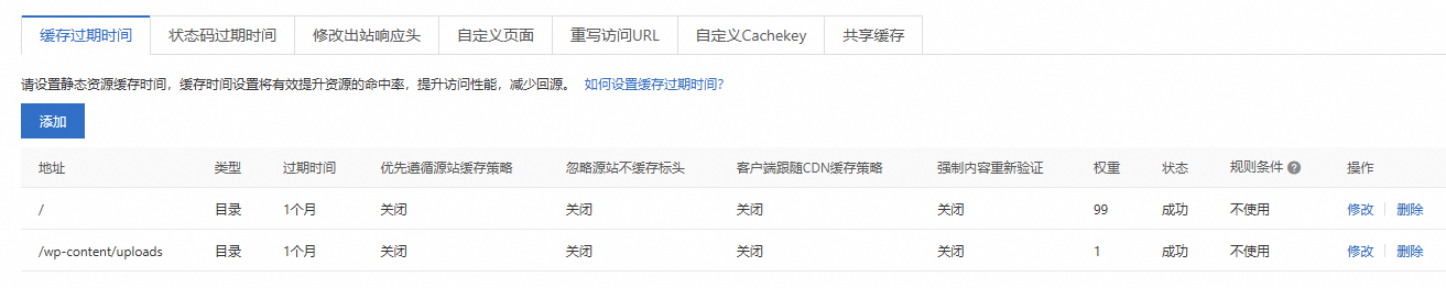 在验证完成后,可以在缓存配置页面增加WordPress的图片路径,为所有图片创建CDN缓存。(默认为/wp-content/uploads)