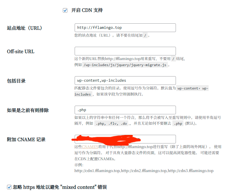 在CNAME记录处填上之前配置CNAME时相同的值即可,另外不要再”包括目录“中填入重复的路径,如"wp-content","wp-content/uploads",会导致缓存的静态文件不可访问。